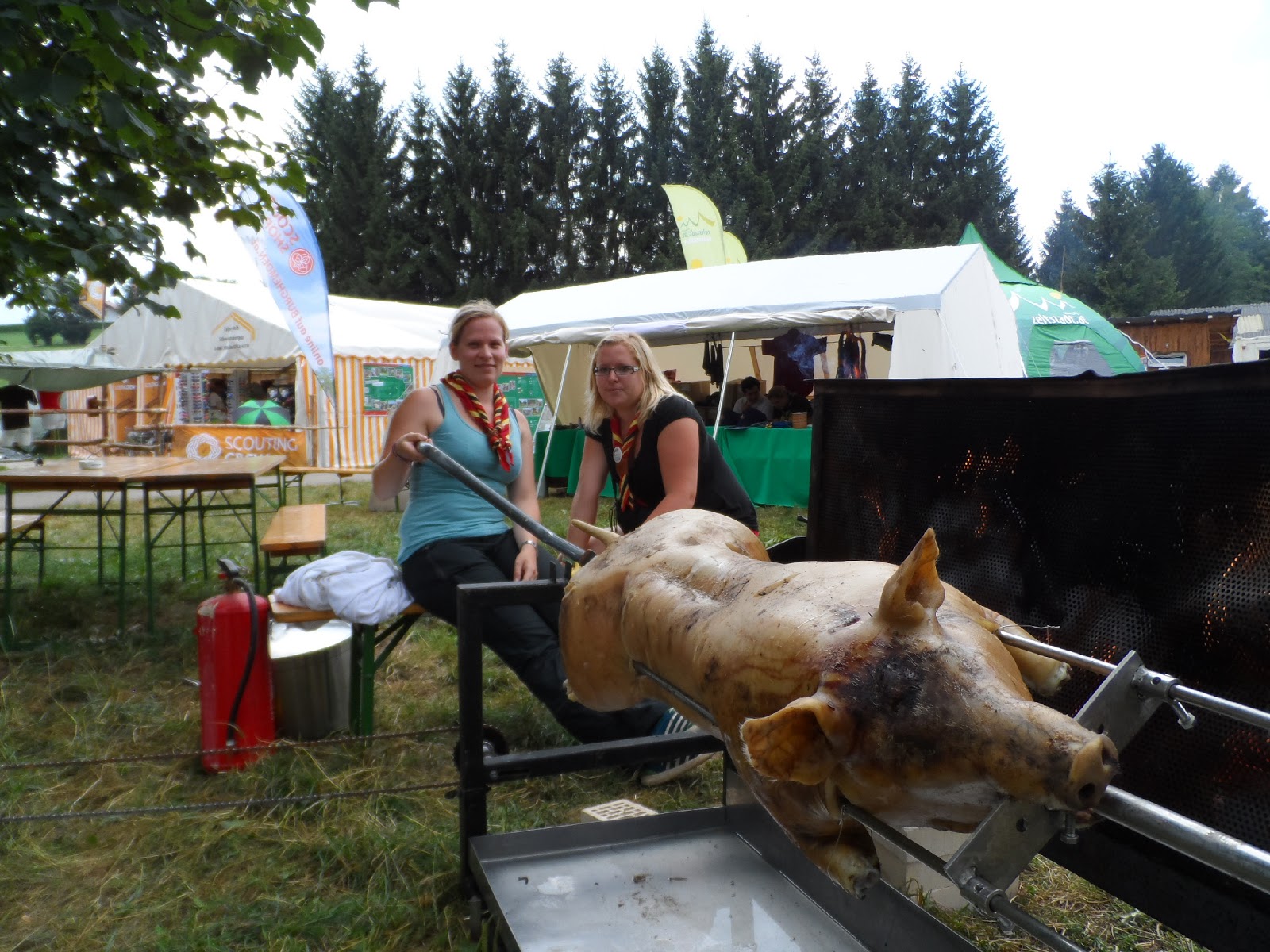 Da wir am nächsten Morgen zum Workshop "Youtopia" mussten, konnten wir nicht ausschlafen und so wurde aus der Wanderung für uns eher ein "Stationenschlaf". Danach konnten wir uns auch nicht wirklich ausrasten, da wir das Spanferkel für den Tag der offenen Töpfe vorbereiten und braten mussten. Dieses Essen kam bei allen Pfadfindern sehr gut an. Nachdem wir die Kochstelle gründlichst aufgeräumt hatten, ließen wir den Abend im Zelt und im M13 ausklingen.