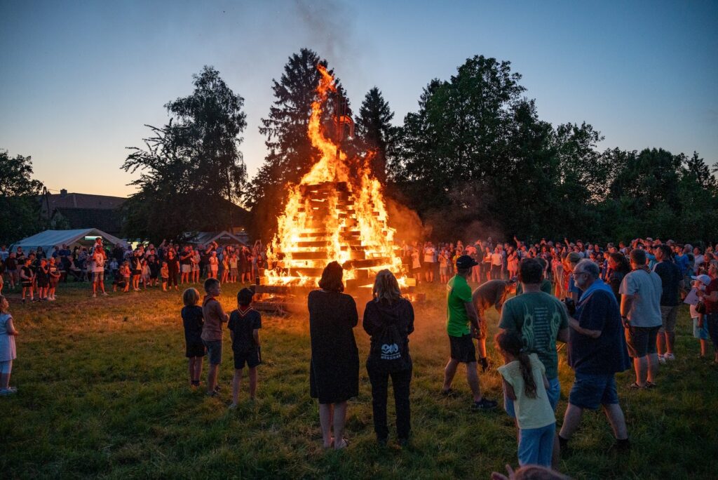 Dem warmen Wetter verdanken wir es, dass wir uns über eine neue Rekordbesucher*innenanzahl bei unserem Sonnwendfeuer freuen durften: über 400 Gäste jeden Alters besuchten uns auf der Pfarrwiese!